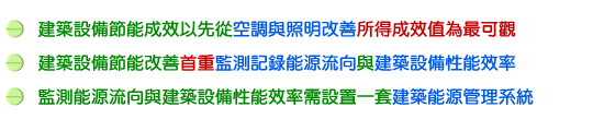 氣溫屢創新高,地球好像在燃燒,人類百年來排放二氧化碳,目前已全面牽動我們的生存環境。這顆美麗的地球正遭受嚴重的威脅,殘害它的元兇即是人類排放在大氣層的溫室氣體。台灣近年來的CO2排放量增加速度顯得十分突出,這種增加速度若持續下去,未來必造成台灣經濟發展的大危機。所以經濟部能源局宣布擴大進行能源用戶的查核範圍,原本只查核製造業的作法將擴及到服務業,包括百貨商場、量販連鎖店、飯店等用電大戶。對於未達目標依據新法採取祭出重罰,且得採連續罰款直至改善為止。另一方面能源局也正在積極推動「能源技術服務產業」,何謂能源技術服務產業? 就是能源 / 工程服務公司 ( Energy / Engineering Service Company),透由診斷與顧問服務,協助能源用戶進行節能改善工程,以達節約能源與減少溫室氣體排放目的。節能減碳已經是勢在必行的趨勢,至於建築設備能夠進行節能改善的方向與重點,以本事務所多年累積之經驗,大致可以歸納出3個要點: